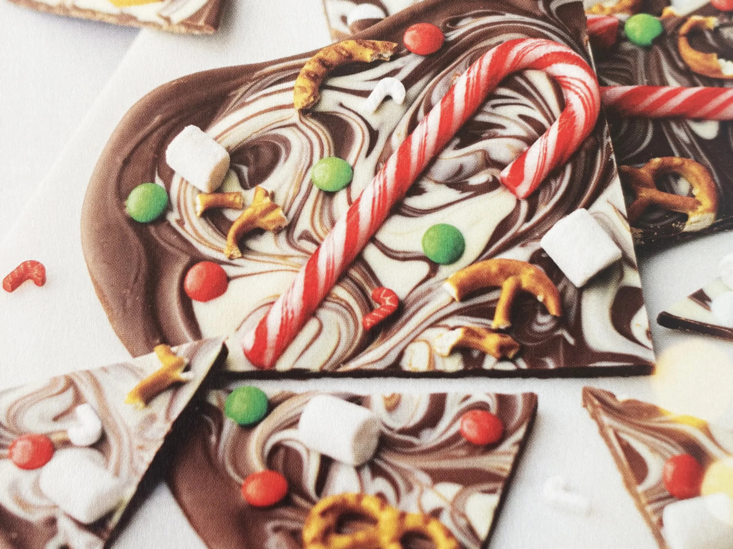 Scatter over the candy canes, crushed pretzels, chocolate beans, mini marshmallows and Christmas sprinkles.